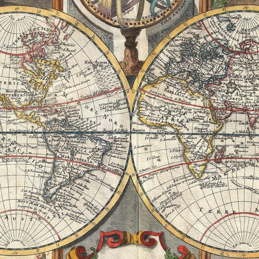 Antique World Map of the Earth, divided into two hemispheres, 1718
