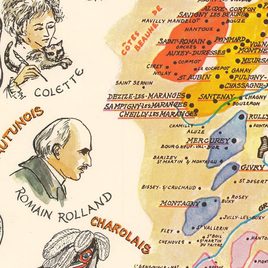 Old pictorial map of Burgundy wine region, 1950