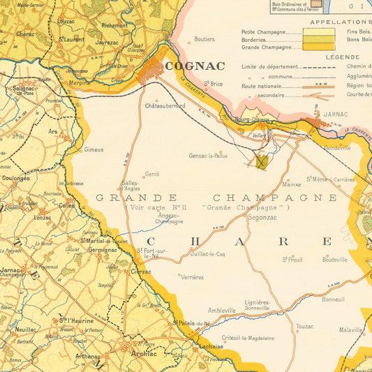 Old wine map of Cognac, Petite Champagne and Borderies, Charente Maritime, 1947