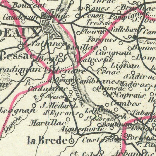 Old map of Bordeaux region, dept. de la Gironde, 1852