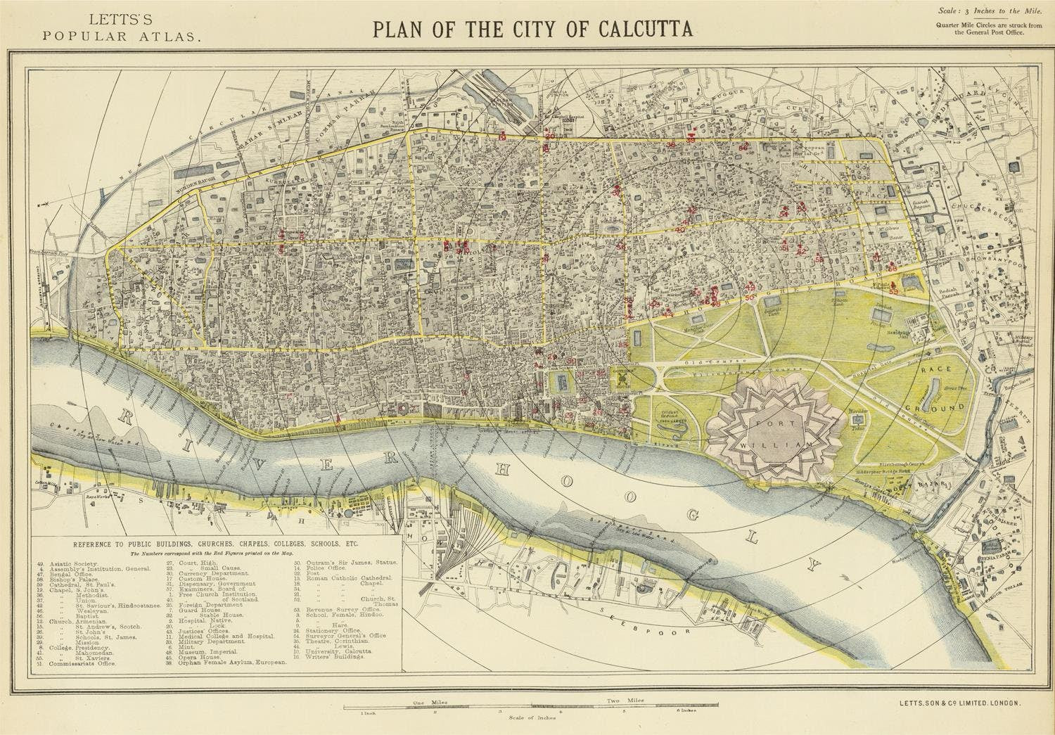In 1883, Calcutta was a significant city in British India and served as the capital of the Bengal Presidency. As an important trading and administrative center, it attracted the attention of map publishers like Letts, Son & Co., who produced maps to cater to the growing demand for accurate geographical information.