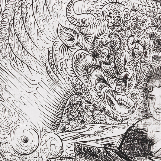 Pablo Picasso, Bull headed Harpy and four little girls on a tower topped with a black flag, 1934