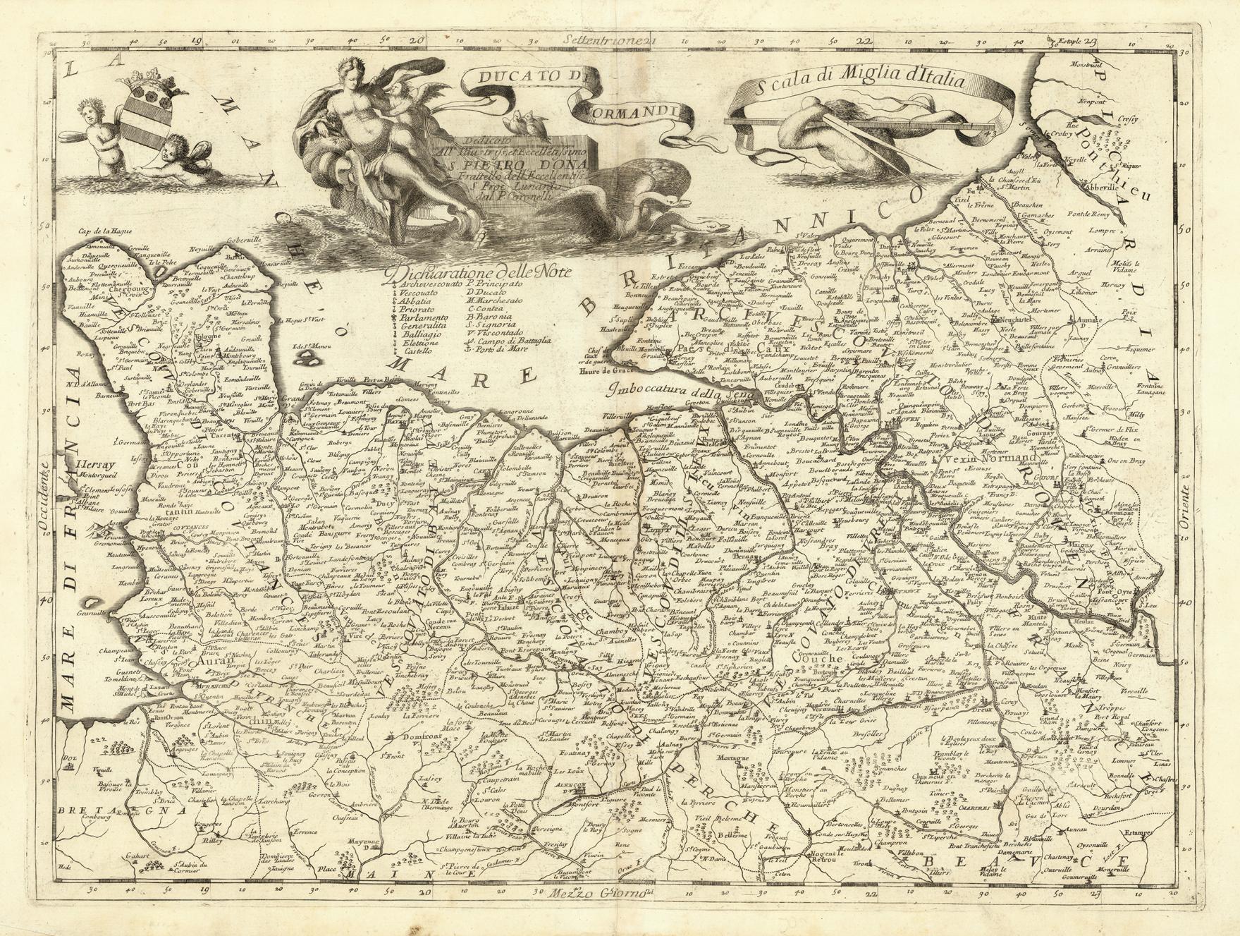 The Ducato di Normandia, engraved by Vincenzo Maria Coronelli (1650–1718) around 1690, is a superb example of late 17th-century Italian cartography, combining scientific precision with the ornate artistry that made Coronelli one of the greatest mapmakers of his age. This map presents the historic Duchy of Normandy, a region of northern France renowned for its medieval heritage, rich agricultural lands, and enduring role in European history.