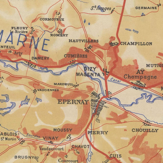 Old wine map of Champagne, Reims, Epernay, 1948