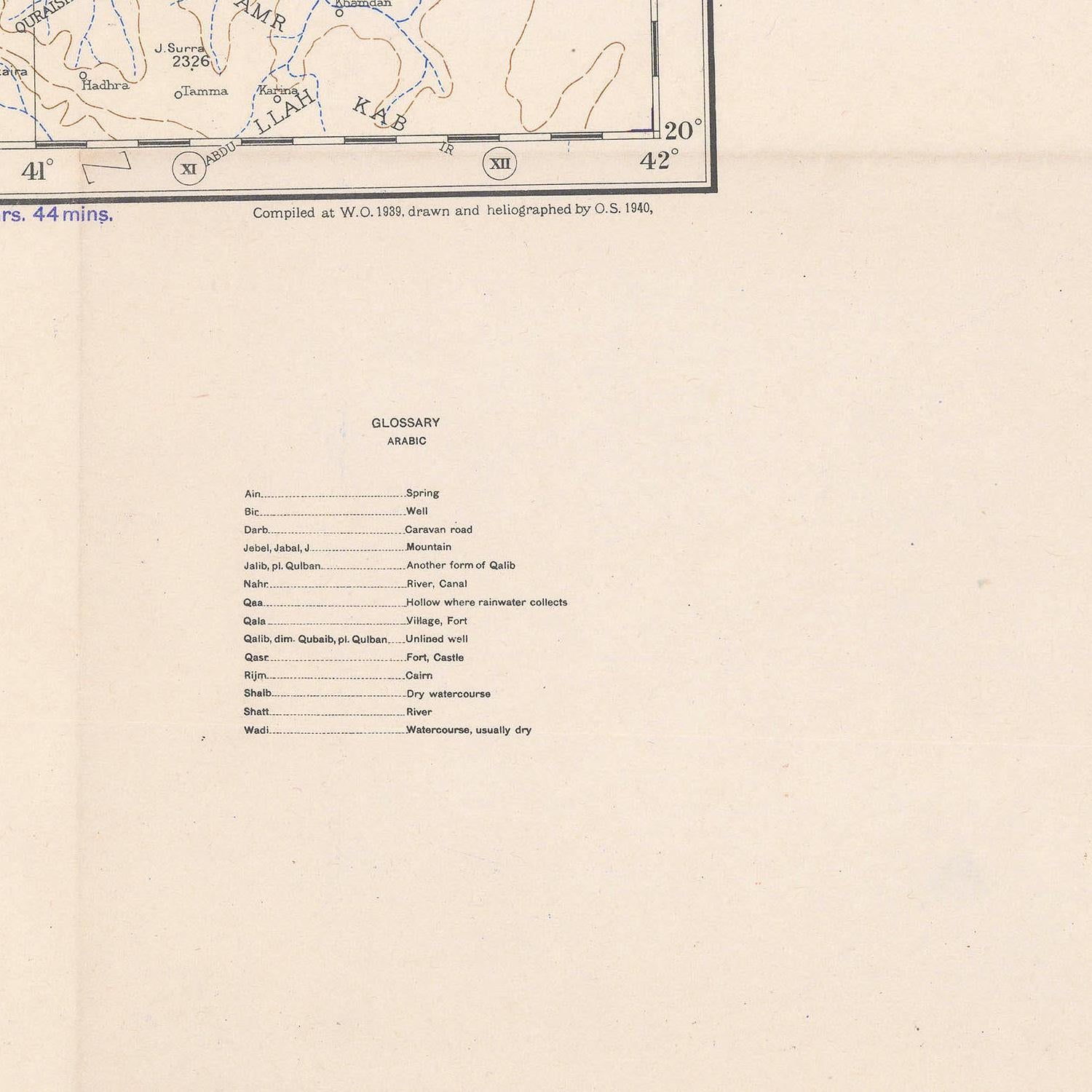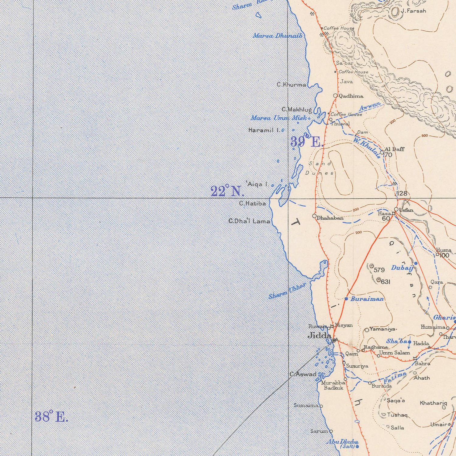 The Map of Mecca and Jeddah, produced in 1943, offers a rare and historically significant view of two of the most important cities in the Arabian Peninsula during a period of global upheaval and regional transformation. Created in the midst of the Second World War, this map reflects both the geopolitical importance of the Hejaz region and the enduring cultural and religious centrality of Mecca, the holiest city in Islam, and Jeddah, its vital port on the Red Sea.