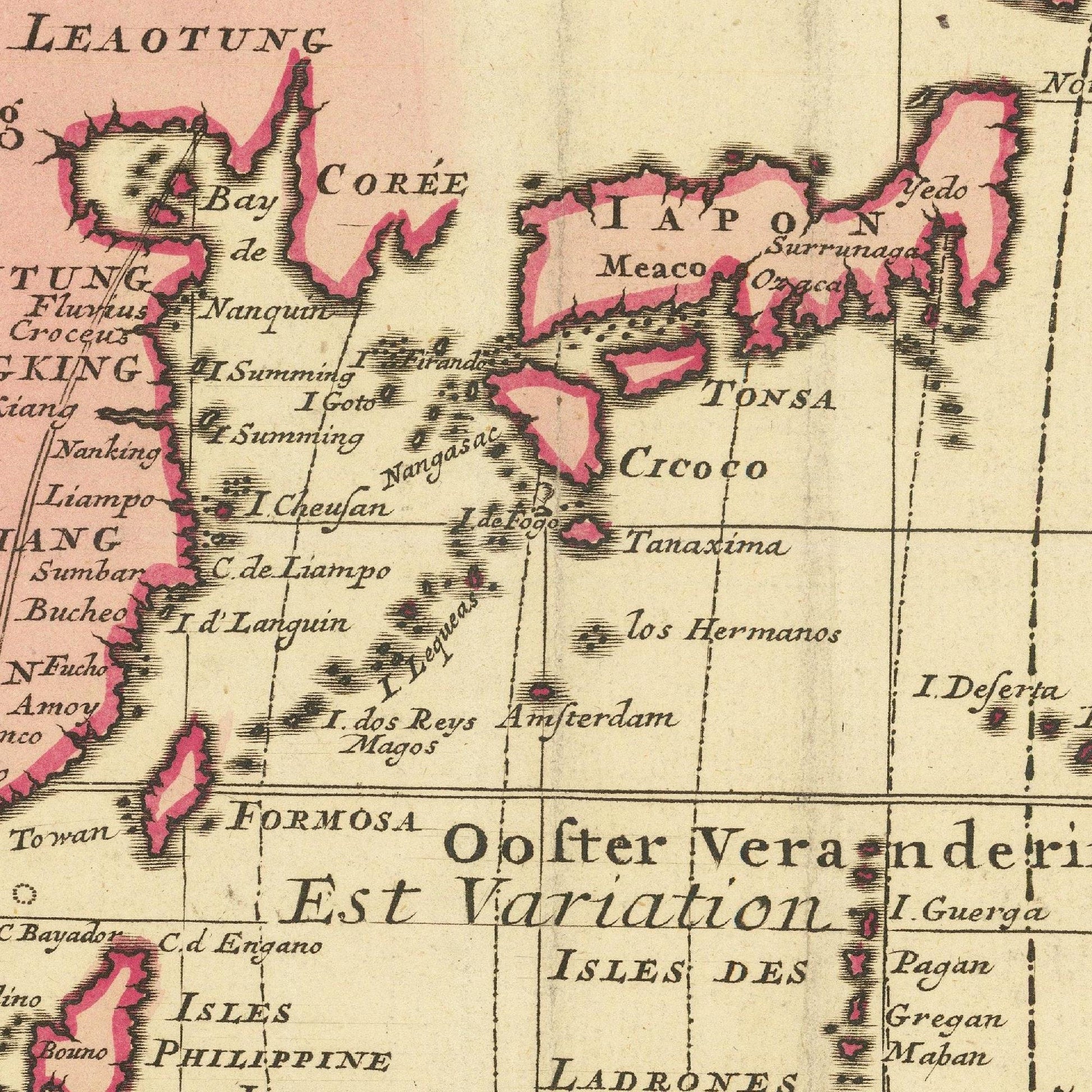 The map covers the entire globe, with the Americas on the left and the Eastern Hemisphere on the right. It is known for its detailed and accurate representation of the coastlines and its inclusion of various astronomical data such as magnetic declination and the locations of observatories. It was important for navigation, cartography and the study of the Earth.